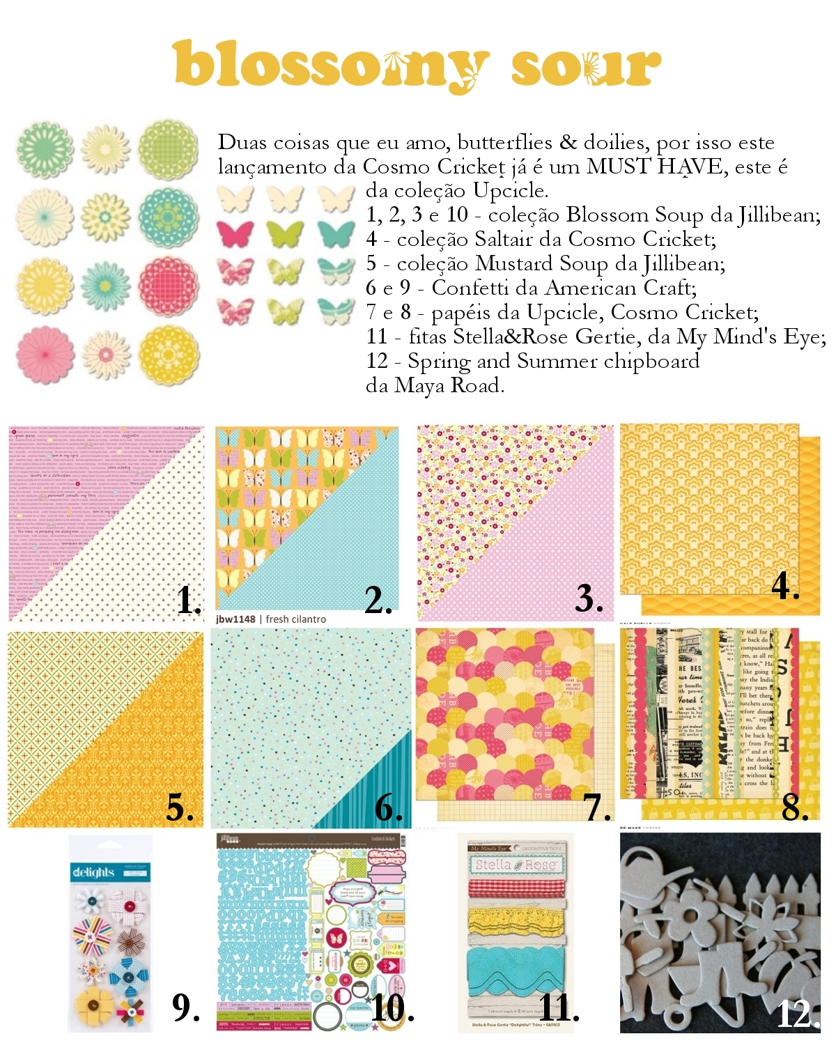 Introduzo então a minha coleção de novidades sour, quer significa ácido em inglês. Para este apanhado de novidades, escolhi produtos com cores acidamente fortes para combinar com os dias de primavera/verão que estarão a chegar. O nome do kit blossomy sour foi escolhido em referência a coleção da Jillibean Soup, Blossom Soup. Também neste kit está incluído produtos da coleção Upcicle e Saltair da Cosmo Cricket.