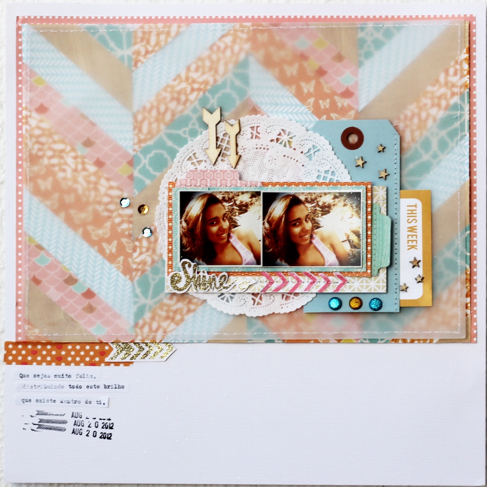 Foi o layout duplo que mais gostei. Vejo nele as cores alegres, a mistura gráfica de diferentes estampas num background branco, o título handmade e o journaling em vellum, sou eu toda aqui.